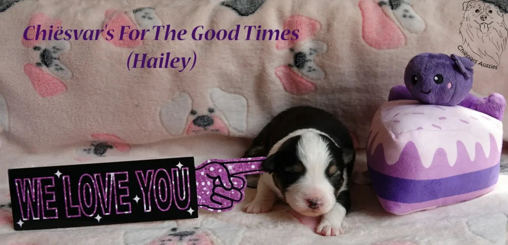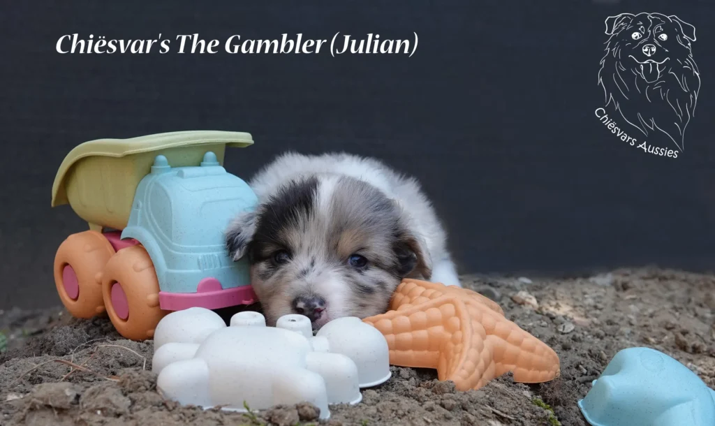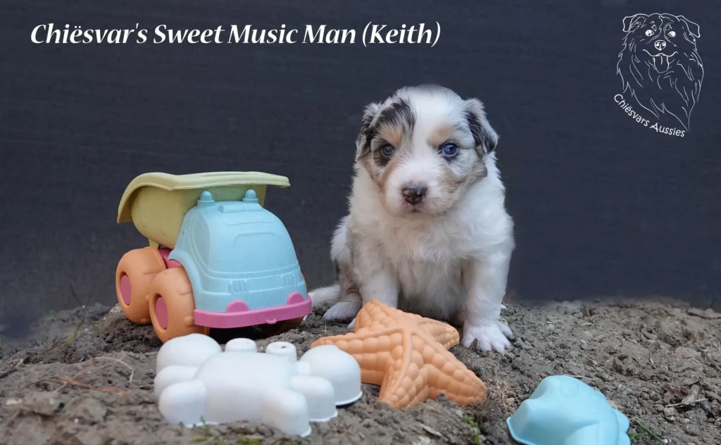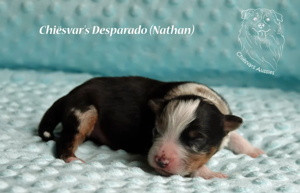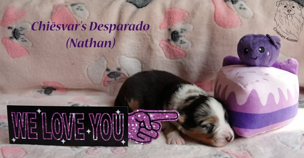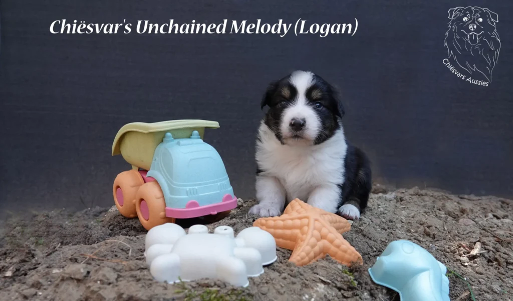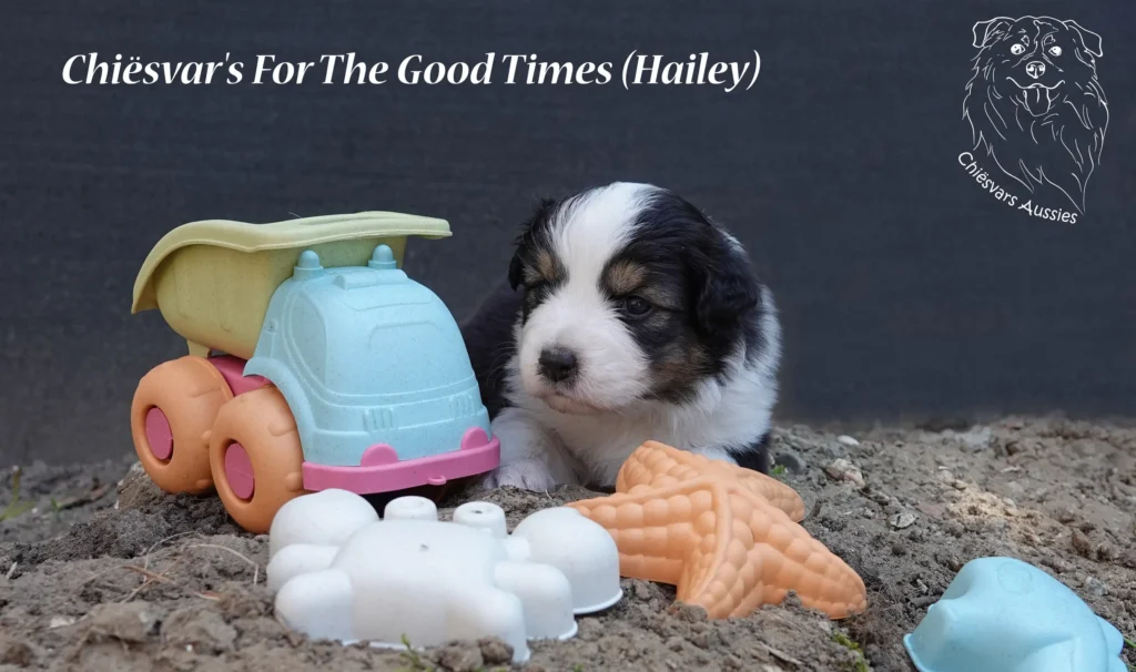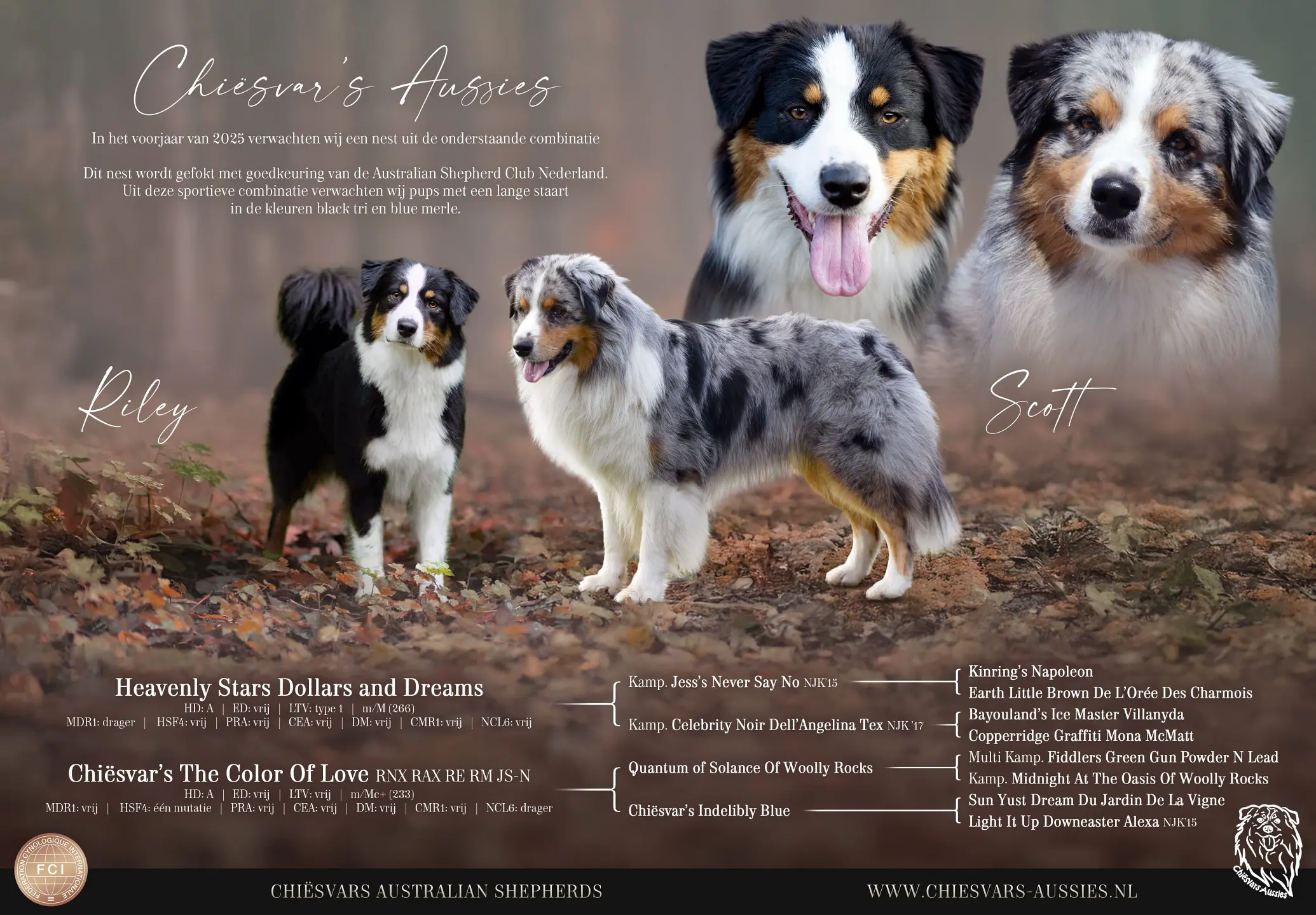 Riley is op 22 maart 2025 gedekt door Scott en op 20 mei 2025 zijn er 7 pups geboren, 4 reutjes en 3 teefjes. 1 black tri, 3 blue merle reutjes en 2 black tri en 1 blue merle teefje.