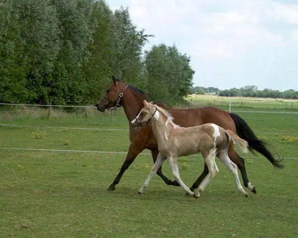 Okidokie heeft op 30 maart 2002 het leven geschonken aan een Palomino Tobiano Paint Horse hengst, After Docs Moon (Docsy).